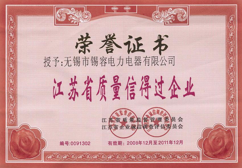 2008年江蘇省質(zhì)量監(jiān)督管理委員會(huì)、江蘇省企業(yè)誠(chéng)信調(diào)查評(píng)估委員會(huì),授予無(wú)錫市錫容電力電器有限公司 “江蘇省信得過(guò)企業(yè)”榮譽(yù)證書